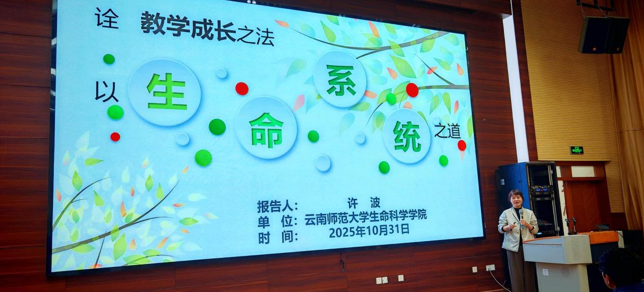 云南师范大学许波教授,第五届全国高校教师教学创新大赛云南省省赛特等奖、国赛三等奖获得者,以《以生命系统之道,诠教学成长之法》为题,从生命系统的整体性、关联性视角出发,分享了个人微生物教学创新历程与经验,强调教学成长需兼顾知识传授、能力培养与价值引领,引发在场教师的深度共鸣。